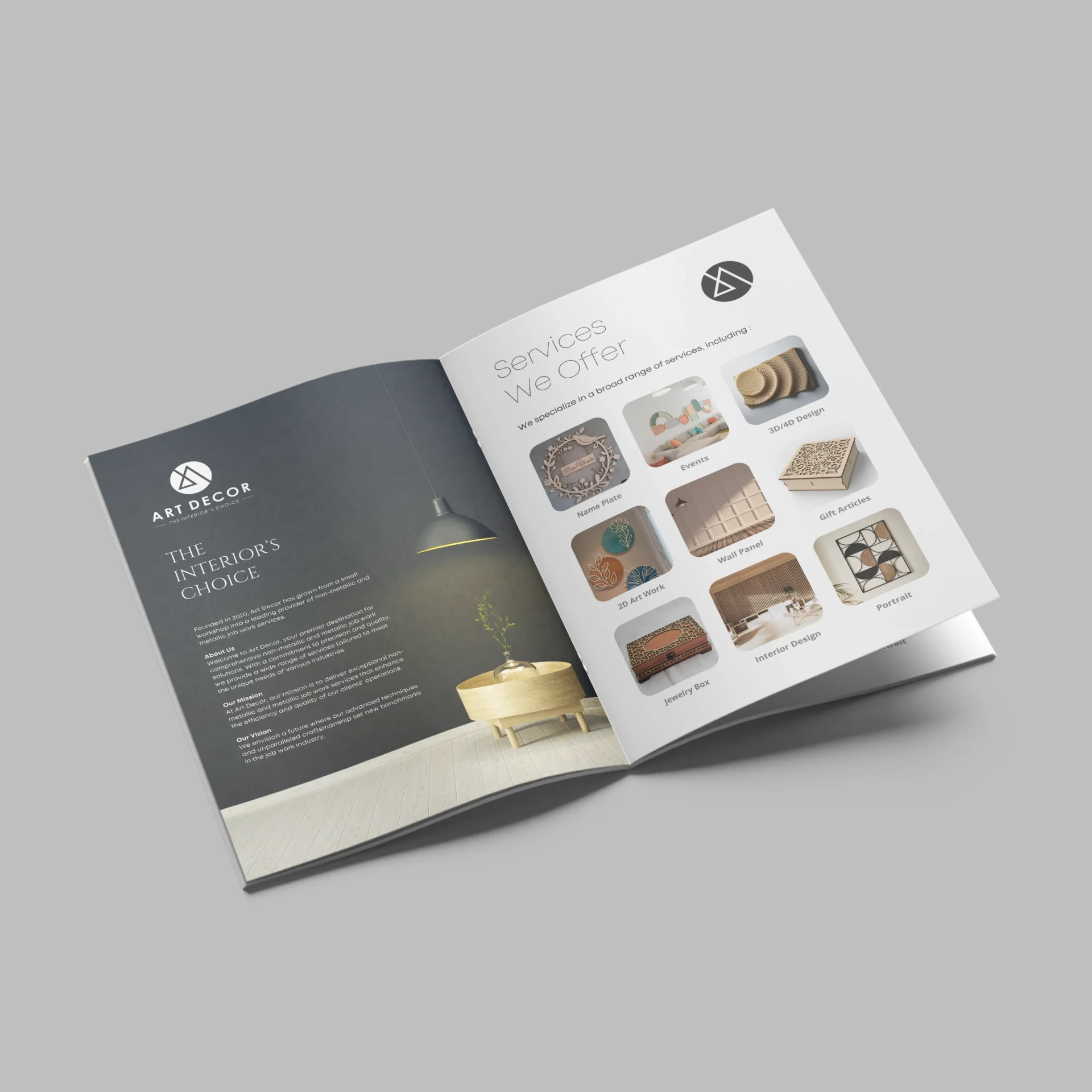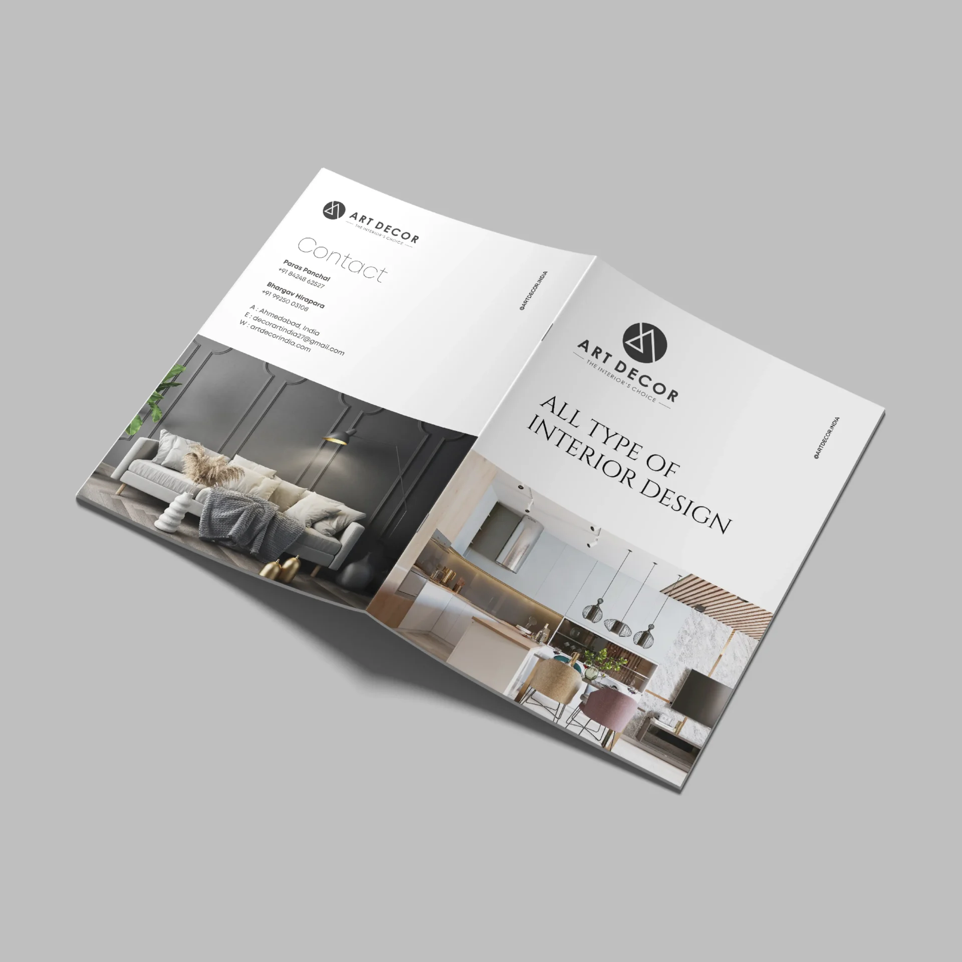 This brochure design project for Art Decor was created to reflect the brand’s elegant and creative identity through a clean, minimal and visually refined layout. The brochure showcases the brand’s services with modern typography, premium interior imagery and a structured presentation that feels both stylish and professional. It serves as an effective marketing piece designed to present Art Decor’s offerings in a visually appealing and impactful way.